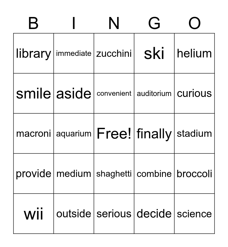 This bingo card has a free space and 24 words: medium, outside, convenient, wii, helium, library, smile, immediate, finally, shaghetti, auditorium, macroni, combine, broccoli, aside, decide, stadium, zucchini, curious, aquarium, science, provide, ski and serious.