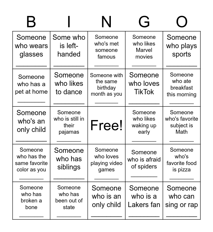 This bingo card has a free space and 24 words: Someone who has siblings ________, Someone who has been out of state ________, Someone with the same birthday month as you ________, Someone who has broken a bone ________, Someone who plays sports ________, Someone who wears glasses ________, Someone who has a pet at home ________, Some who is left-handed ________, Someone who likes waking up early ________, Someone who loves playing video games ________, Someone who loves TikTok ________, Someone who's an only child ________, Someone who is afraid of spiders ________, Someone who's favorite food is pizza ________, Someone who likes to dance ________, Someone who is a Lakers fan ________, Someone who's favorite subject is Math ________, Someone who's met someone famous ________, Someone who ate breakfast this morning ________, Someone who is still in their pajamas ________, Someone who can sing or rap ________, Someone who has the same favorite color as you ________, Someone who likes Marvel movies ________ and Someone who is an only child ________.