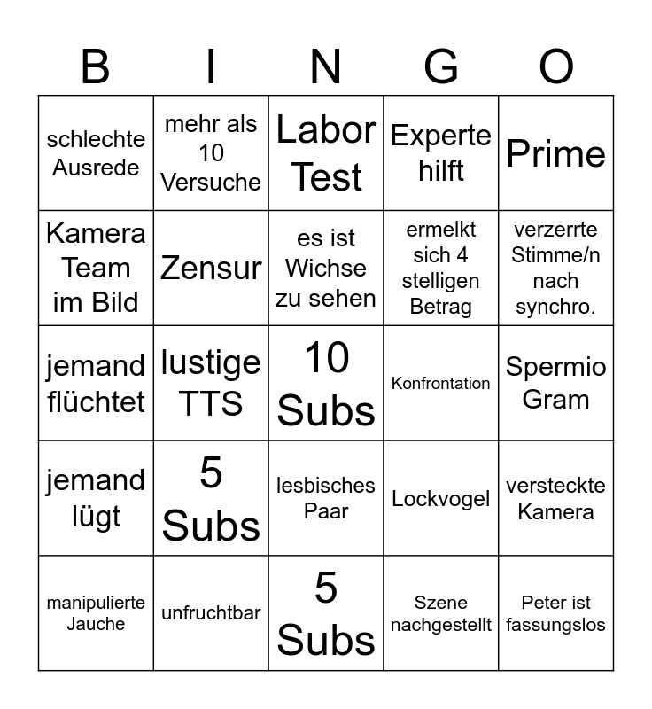 This bingo card has a free space and 24 words: 5 Subs, unfruchtbar, es ist Wichse zu sehen, manipulierte Jauche, Prime, schlechte Ausrede, Kamera Team im Bild, mehr als 10 Versuche, Konfrontation, lesbisches Paar, ermelkt sich 4 stelligen Betrag, jemand flüchtet, Lockvogel, versteckte Kamera, Zensur, Szene nachgestellt, Spermio Gram, Labor Test, verzerrte Stimme/n nach synchro., lustige TTS, Peter ist fassungslos, jemand lügt, Experte hilft and 5 Subs.