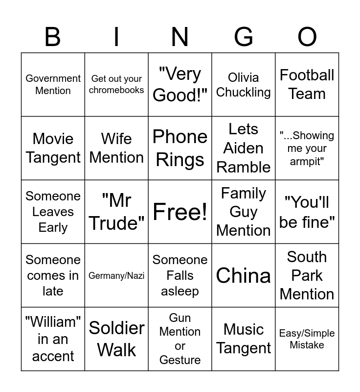 This bingo card has a free space and 53 words: Son Mention, Easy/Simple Mistake, 8 Graphs Mentioned, Music Tangent, Germany/Nazi, Daughter(s) Mention, Get out your chromebooks, Dawson is Smart, Movie Tangent, Japan, Wife Mention, Not taking the AP, South Park Mention, China, Twin Brother Mention, "William" in an accent, Phone Rings, Family Guy Mention, Ukraine/Russia, Football Team, "Mr Trude", Chewing Gum, Lets Aiden Ramble, Government Mention, "Stay with me", Soldier Walk, Lacrosse, No Phones, Wedding Photography, "...Showing me your armpit", Javelin, Wrestling, Military Mention, Travel/Trip Mention, "Okay guys", Taps Stick, Olivia Chuckling, Gun Mention or Gesture, "Very Good!", Drinks or Mentions Coffee, Rebecca talks about her brother, Freshman Mentioned, "You'll be fine", Wait for the bell, Boxing or Mike Tyson, Someone Falls asleep, "No, but you're on the right track", T Chart Mentioned, Someone Leaves Early, Someone comes in late, "Wait till the bell rings", Girls/Ladies and "Are we ready?".