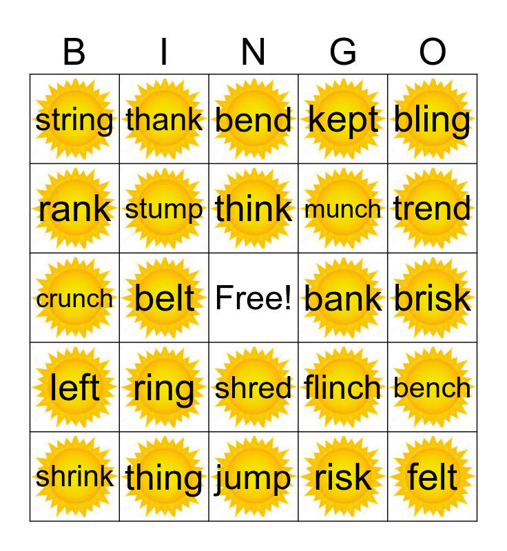 This bingo card has 24 images, a free space and 24 words: ring, thing, think, shrink, bling, string, rank, thank, bank, shred, munch, crunch, flinch, bench, stump, risk, brisk, bend, trend, belt, felt, left, kept and jump.