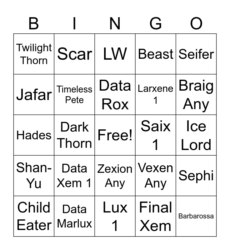 This bingo card has a free space and 24 words: Data Xem 1, Data Marlux, Data Rox, Child Eater, Seifer, Twilight Thorn, Jafar, Scar, Saix 1, Zexion Any, Larxene 1, Hades, Vexen Any, Sephi, Timeless Pete, Final Xem, Ice Lord, LW, Braig Any, Dark Thorn, Barbarossa, Shan-Yu, Beast and Lux 1.