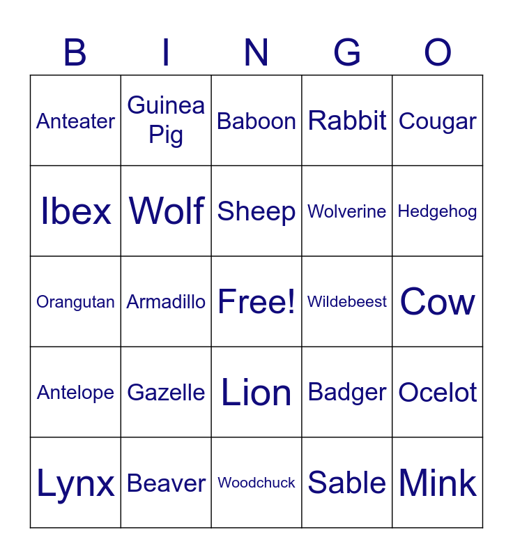 This bingo card has a free space and 87 words: Elephant, Cheetah, Lion, Tiger, Deer, Bear, Giraffe, Hippopotamus, Horse, Dog, Cat, Wolf, Ocelot, Cow, Goat, Sheep, Aardvark, Tiger, Sloth, Mouse, Chipmunk, Squirrel, Orangutan, Skunk, Sable, Sambar, Raccoon, Reindeer, Llama, Sheep, Beaver, Babirusa, Donkey, Gazelle, Ibex, Elk, Hedgehog, Moose, Ox, Armadillo, Yak, Mongoose, Alpaca, Wildebeest, Kudu, Cougar, Civet, Guinea Pig, Javelina, Boar, Bison, Deer, Antelope, Kangaroo, Wallaby, Tasmanian Devil, Wolverine, Wombat, Fox, Rabbit, Wolf, Hyena, Camel, Capuchin, Gorilla, Leopard, Coyote, Lynx, Mink, Panda, Lemur, Warthog, Baboon, Badger, Dingo, Ferret, Weasel, Woodchuck, Koala, Opossum, Okapi, Porcupine, Platypus, Rhinoceros, Zebra, Anteater and Chinchilla.