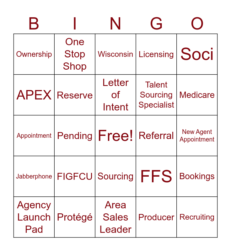 This bingo card has a free space and 70 words: Webex, New Agent Appointment, Retail, Acquisition, Protégé, Background Check, Licensing, Capital Verification, Soci, Foleon, Bookings, PROPS, Ownership, Wisconsin, Iowa, Pending, Sourcing, Talent Sourcing Specialist, New Agent Specialist, Jabberphone, Referral, FFS, Medicare, High Performance Culture, Journey, Grand Opening, Military Bonus, University of Farmers, Producer, Launch, One Stop Shop, Business, Individual, Candidates, Incentives, Professor Burke, Insurance, Foremost, Bristol West, APEX, ACE, FIGFCU, Recruiting, Kraft Lake, Agency Dashboard, Reserve, Agency Launch Pad, Interview, Deep Dive, Pitch Deck, LinkedIn, ZipRecruiter, Wall Street Jobs, Bookings, Area Sales Leader, Staff, Letter of Intent, Ohio, North Dakota, South Dakota, Appointment, Bonus Program, Training, Commission, Docusign, Contract, Property, Casualty, Life and Health.