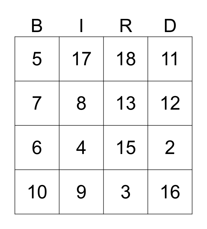 This bingo card has 16 words: 9, 2, 18, 5, 6, 17, 15, 3, 7, 8, 10, 11, 4, 12, 13 and 16.