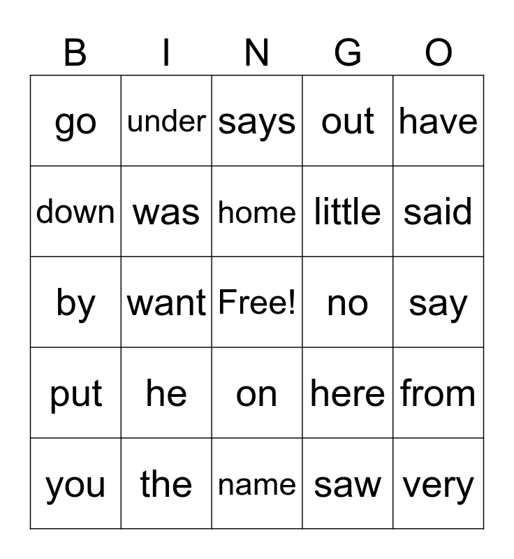 This bingo card has a free space and 24 words: he, the, home, you, have, go, down, under, no, on, little, by, here, from, was, saw, say, says, said, want, very, put, out and name.
