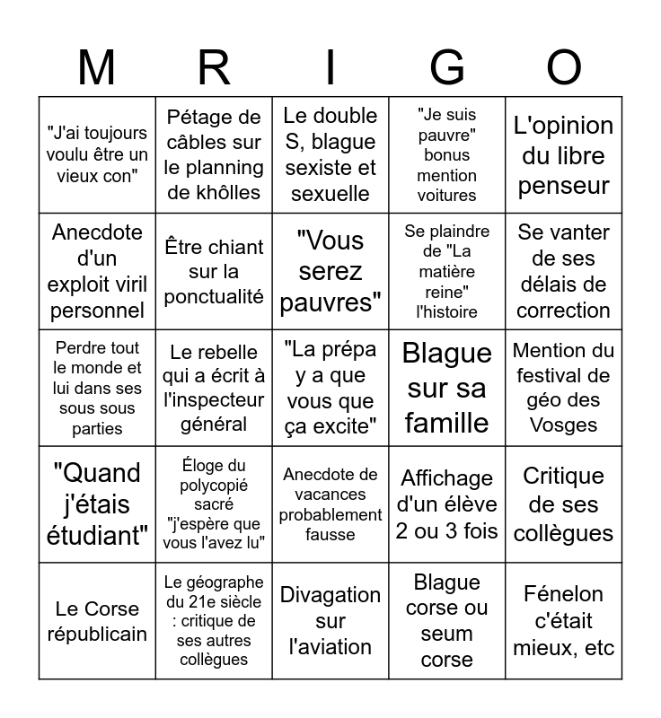 This bingo card has a free space and 27 words: Gossip girl : anecdote sur une personnalité, Le géographe du 21e siècle : critique de ses autres collègues, "Vous serez pauvres", Blague corse ou seum corse, L'opinion du libre penseur, Anecdote d'un exploit viril personnel, Pétage de câbles sur le planning de khôlles, Divagation sur l'aviation, Blague sur sa famille, Critique de ses collègues, "Quand j'étais étudiant", Être chiant sur la ponctualité, Affichage d'un élève 2 ou 3 fois, Fénelon c'était mieux, etc, Perdre tout le monde et lui dans ses sous sous parties, Mention de Stéphanie sa BFF, Le double S, blague sexiste et sexuelle, "Je suis pauvre" bonus mention voitures, Mention du festival de géo des Vosges, "J'ai toujours voulu être un vieux con", Éloge du polycopié sacré "j'espère que vous l'avez lu", Anecdote de vacances probablement fausse, Se plaindre de "La matière reine" l'histoire, Se vanter de ses délais de correction, Le Corse républicain, Le rebelle qui a écrit à l'inspecteur général and BINGO !.