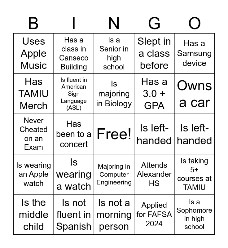 This bingo card has a free space and 60 words: Is their 2nd year in the program, Is not fluent in Spanish, Plans to live out of town, Is wearing an Apple watch, Applied for FAFSA 2024, Plans to Study Abroad, Is fluent in American Sign Language (ASL), Attends/ graduated LBJ HS, Has a 3.0 + GPA, Is a Freshman at TAMIU, Slept in a class before, Played an instrument in High School, Has TAMIU Merch, Graduated HS with Honors, Has a class in Canseco Building, Uses Apple Music, Is a Sophomore in high school, Has a Samsung device, Work-study at TAMIU, Is majoring in Biology, Is left-handed, Is a Senior in high school, Is the middle child, Is taking 5+ courses at TAMIU, Majoring in Psychology, Walks to school, Knows how to swim, Is their 1st year in the program, Owns a car, Has a class in AIC Building, Is majoring in Business Administration, Is their 3rd year in the program, Is their 2nd year in the program, Has a driver's license?, Has a class in Canseco Building, Has a birthday in the same month as you, Has a part-time job while attending TAMIU, Has been to a concert, Is the oldest sibling, Never Cheated on an Exam, Has never been on a plane, Is wearing a watch, Is left-handed, Is majoring in Criminal Justice, Attends Alexander HS, Applied for FAFSA 2024, Is fluent in Spanish, Is the oldest in your table, Is taking 4+ courses at TAMIU, Majoring in Computer Engineering, Is not a morning person, Attends LBJ HS, Uses Spotify, Attends United South HS, Participates in UIL, Is their last year in the program, Loves to Travel, Is a Junior in high school, Attends United HS and Pulled an all-nighter to finish an assignment..