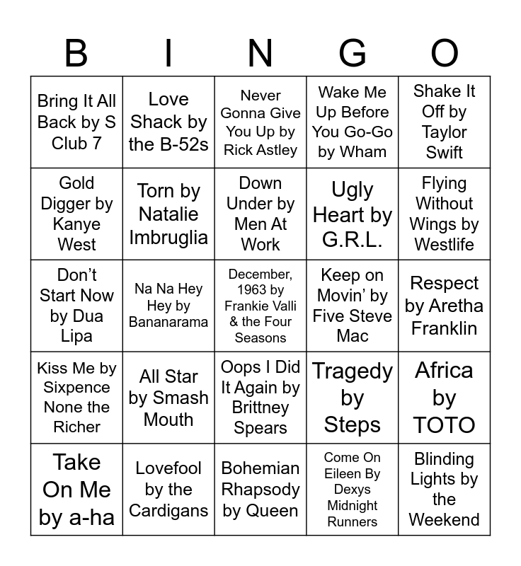 This bingo card has 120 words: Dancing Queen by ABBA, Wannabe by Spice Girls, Barbie Girl by Aqua, Mambo No. 5 by Lou Bega, I Wanna Dance With Somebody by Whitney Houston, Livin La Vida Loca by Ricky Martin, Wake Me Up Before You Go-Go by Wham, Don’t Stop Believin’ by Journey, Africa by TOTO, Girls Just Want to Have Fun by Cyndi Lauper, I Want it That Way by Backstreet Boys, Baby One More Time by Brittney Spears, Free!, Everybody by Backstreet Boys, Who Let the Dogs Out by Baha Men, Macarena by Los Del Rio, Oops I Did It Again by Brittney Spears, Mamma Mia by ABBA, What is Love by Haddaway, Genie in a Bottle by Christina Aguilera, Take On Me by a-ha, Never Gonna Give You Up by Rick Astley, Stayin Alive by Bee Gees, Walking on Sunshine by Katrina & The Waves, Gimme! Gimmee! Gimmee! By ABBA, Kiss Me by Sixpence None the Richer, Lovefool by the Cardigans, Eacape (The Pina Colada Song) by Rupert Holmes, Then He Kissed Me by The Crystals, Our House by Madness, Come On Eileen By Dexys Midnight Runners, Na Na Hey Hey by Bananarama, Down Under by Men At Work, I’m Gonna Be (500 miles) by The Proclaimers, Tainted Love by Soft Cell, Baggy Trousers by Madness, You Spin Me Round by Dead or Alive, Call Me by Blondie, YMCA by Village People, Grease ( You’re the One That I Want) by Arthur Bentley and Anita Benson, Born to Hand Jive by Sha Na Na, Copacobana by Barry Manilow, The Hustle by Van McCoy & The Soul City Symphony, Build Me Up Buttercup by The Foundations, Uptown Girl by Billy Joel, I’m A Believer by The Monkees, We Didn’t Start the Fire by Billy Joel, Keep on Movin’ by Five Steve Mac, Got the Feelin’ by Five, Cest La Vie by B Witched, Slam Dunk by Five, S Club Party by S Club 7, Tragedy by Steps, Picture of You by Boyzone, World of Our Own by Westlife, Stan by Eminem, Purple Rain by Prince, Raspberry Beret by Prince, Once In A lifetime by Talking Heads, Love Shack by the B-52s, Say My Name by Destiny’s Child, No Scrubs by TLC, Bills, Bills, Bills by Destiny’s Child, Fergalicious by Fergie, Toxic by Brittney Spears, Gold Digger by Kanye West, Sk8er Boi by Avril Lavigne, Blinding Lights by the Weekend, Physical by Dua Lipa, What a Man Gotta Do by Jonas Brothers, Don’t Start Now by Dua Lipa, Poker Face by Lady Gaga, Superstition by Stevie Wonder, Juice by Lizzo, The Shoop Shoop Song by Cher, Sucker by Jonas Brothers, Ugly Heart by G.R.L., Hey Ya by Outkast, December, 1963 by Frankie Valli & the Four Seasons, All Star by Smash Mouth, Bring It All Back by S Club 7, Single Ladies by Beyonce, Livin on a Prayer by Bon Jovi, 5, 6, 7, 8 by Steps, Call Me Maybe by Carly Rae Jepsen, Spice Up Your Life by Spice Girls, Bohemian Rhapsody by Queen, Uptown Girl by Westlife, Waterfalls by TLC, Piano Man by Billy Joel, Ring of Fire by Johnny Cash, Respect by Aretha Franklin, Sweet Child o’ Mince by Guns n Roses, Don’t Stop Movin’ by Starship, We Built This City by Starship, Brown Eyed Girl by Van Morrison, Another One Bites the Dust by Queen, Shake It Off by Taylor Swift, Hound Dog by Elvis, Breakfast at Tiffany’s by Deep Blue Something, Oh, Pretty Woman by Roy Orbison, A Thousand Miles by Vanessa Miles, Larger Than Life bu Backstreet Boys, Gettin Jiggy With It by Will Smith, Boombastic by Shaggy, Torn by Natalie Imbruglia, It’s My Life by Dr. Alben, It’s Raining Men by Geri Halliwell, Human by The Killers, Don’t Start Now by Dua Lipa, Senorita by Shawn Mendes, Everybody Get Up by Five, Stop by Spice Girls, Tearin’ up my Heart by NSYNC, Flying Without Wings by Westlife, Show Me The Meaning of Being Lonely by Backstreet Boys, Truly Madly Deeply by Savage Garden, Year 3000 by Busted, We will Rock You by Five, Queen and I Knew I Loved You by Savage Garden.