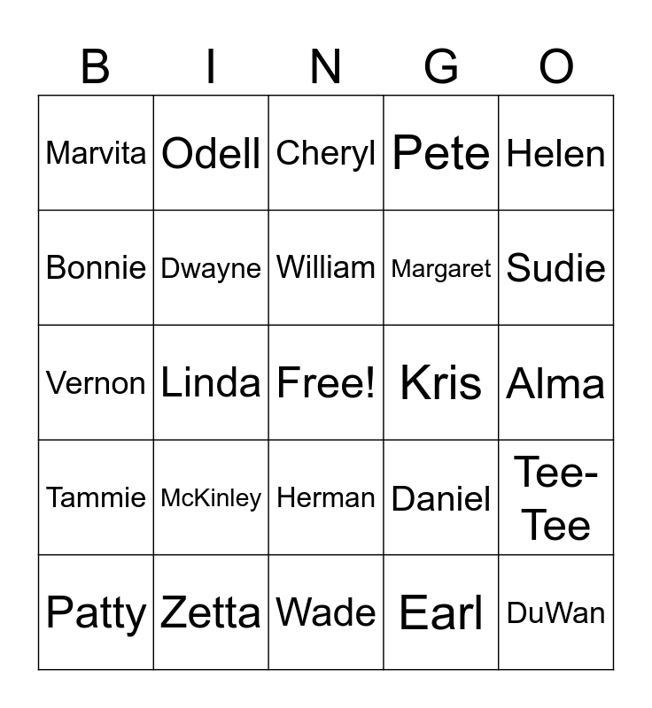 This bingo card has a free space and 24 words: Patty, McKinley, William, Earl, Helen, Marvita, Odell, Cheryl, Kris, Alma, Vernon, Dwayne, Daniel, Tee-Tee, Bonnie, Zetta, Wade, Pete, Sudie, Tammie, Linda, Herman, Margaret and DuWan.