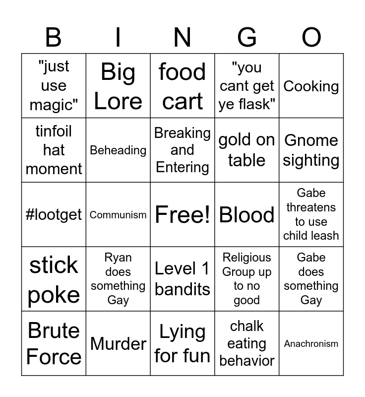 This bingo card has a free space and 24 words: Ryan does something Gay, Murder, Breaking and Entering, Brute Force, Cooking, "just use magic", tinfoil hat moment, Big Lore, Blood, Level 1 bandits, gold on table, #lootget, Religious Group up to no good, Gabe does something Gay, Beheading, chalk eating behavior, Gabe threatens to use child leash, food cart, Gnome sighting, Communism, Anachronism, stick poke, "you cant get ye flask" and Lying for fun.