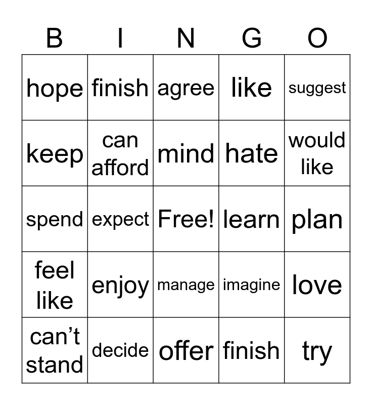 This bingo card has a free space and 30 words: decide, arrange, expect, forget, hope, agree, can afford, manage, learn, offer, plan, try, finish, want, would like, promise, imagine, feel like, enjoy, suggest, spend, miss, finish, hate, keep, like, love, can’t stand, mind and look forward.
