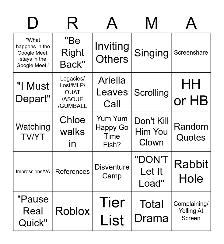 This bingo card has a free space and 24 words: References, Roblox, Ariella Leaves Call, "Pause Real Quick", Screenshare, "What happens in the Google Meet, stays in the Google Meet.", "I Must Depart", "Be Right Back", Don't Kill Him You Clown, Disventure Camp, Scrolling, Watching TV/YT, "DON'T Let It Load", Rabbit Hole, Legacies/ Lost/MLP/ OUAT /ASOUE /GUMBALL, Total Drama, Random Quotes, Inviting Others, HH or HB, Chloe walks in, Complaining/ Yelling At Screen, Impressions/VA, Singing and Tier List.