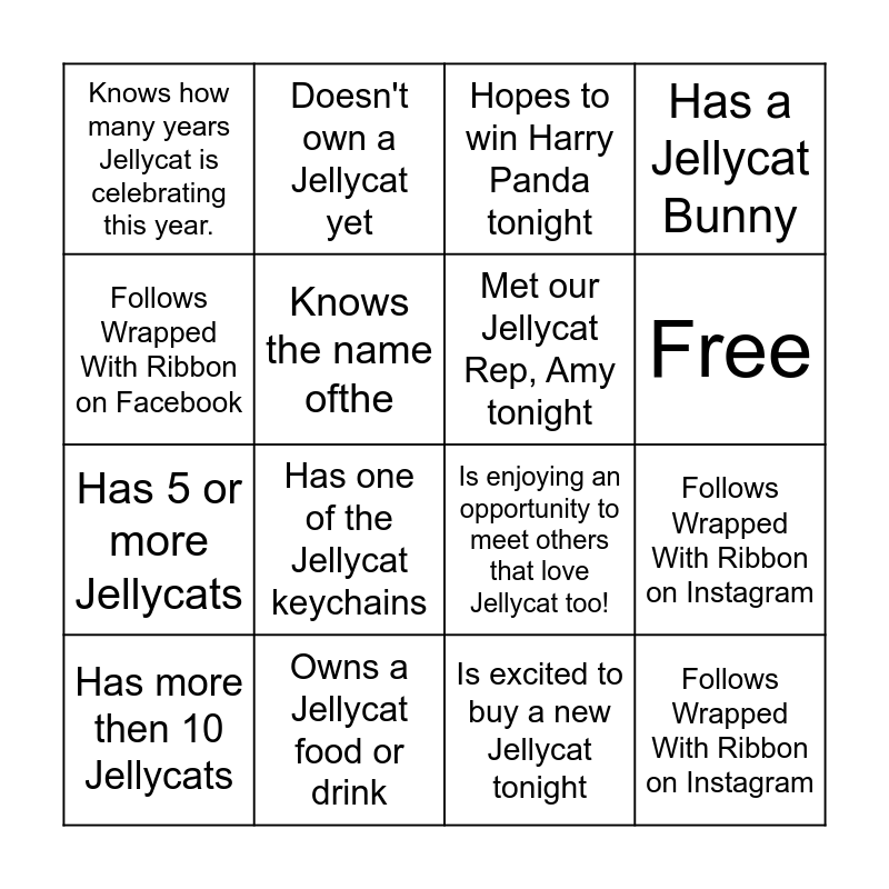 This bingo card has 17 words: Is excited to buy a new Jellycat tonight, Has more then 10 Jellycats, Hopes to win Harry Panda tonight, Knows how many years Jellycat is celebrating this year., Has one of the Jellycat keychains, Has a Jellycat Bunny, Follows Wrapped With Ribbon on Instagram, Met our Jellycat Rep, Amy tonight, Free, Knows the name ofthe, Owns a Jellycat food or drink, Is enjoying an opportunity to meet others that love Jellycat too!, Follows Wrapped With Ribbon on Facebook, Doesn't own a Jellycat yet, Has 5 or more Jellycats, Has received a Jellycat as a gift and Follows Wrapped With Ribbon on Instagram.