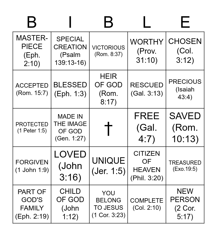 This bingo card has a free space and 24 words: LOVED (John 3:16), CHILD OF GOD (John 1:12), HEIR OF GOD (Rom. 8:17), PART OF GOD'S FAMILY (Eph. 2:19), CHOSEN (Col. 3:12), MASTER- PIECE (Eph. 2:10), ACCEPTED (Rom. 15:7), SPECIAL CREATION (Psalm 139:13-16), FREE (Gal. 4:7), UNIQUE (Jer. 1:5), RESCUED (Gal. 3:13), PROTECTED (1 Peter 1:5), CITIZEN OF HEAVEN (Phil. 3:20), TREASURED (Exo.19:5), BLESSED (Eph. 1:3), COMPLETE (Col. 2:10), SAVED (Rom. 10:13), VICTORIOUS (Rom. 8:37), PRECIOUS (Isaiah 43:4), MADE IN THE IMAGE OF GOD (Gen. 1:27), NEW PERSON (2 Cor. 5:17), FORGIVEN (1 John 1:9), WORTHY (Prov. 31:10) and YOU BELONG TO JESUS (1 Cor. 3:23).