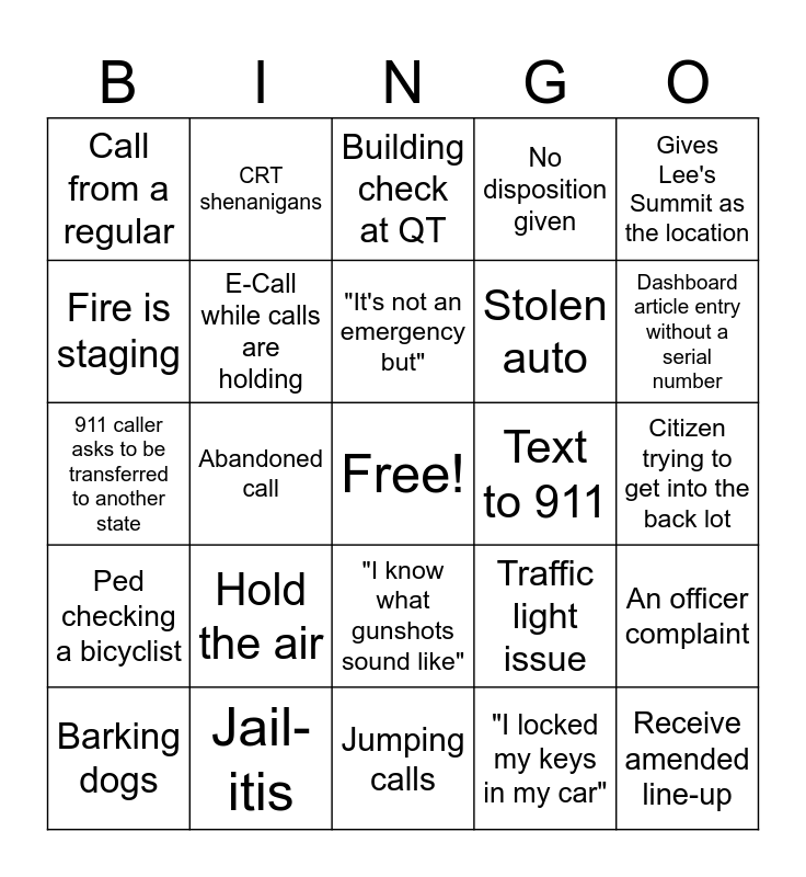 This bingo card has a free space and 24 words: Hold the air, Jail-itis, "It's not an emergency but", Barking dogs, Gives Lee's Summit as the location, Call from a regular, Fire is staging, CRT shenanigans, Text to 911, "I know what gunshots sound like", Stolen auto, 911 caller asks to be transferred to another state, Traffic light issue, An officer complaint, E-Call while calls are holding, "I locked my keys in my car", Citizen trying to get into the back lot, Building check at QT, Dashboard article entry without a serial number, Abandoned call, Receive amended line-up, Ped checking a bicyclist, No disposition given and Jumping calls.