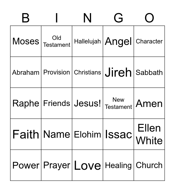 This bingo card has a free space and 24 words: Name, Prayer, Christians, Power, Character, Moses, Abraham, Old Testament, New Testament, Elohim, Jireh, Raphe, Issac, Ellen White, Provision, Healing, Amen, Hallelujah, Sabbath, Friends, Church, Faith, Angel and Love.