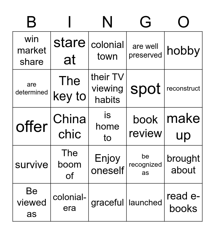 This bingo card has 110 words: textbook, travel brochure, book review, science journal, living habits, habitat, natural enemies, behave poorly, microsleep, matter, survival, impressive, Were filled with adventure and laughter, unexpected advantages, brought us closer, bring out, offer, recommend, project, tradition, brought about, result from, make up for, adventure, adoption assistant, their TV viewing habits, hobby, popularity, data, replace its old system, reconstruct, are well preserved, colonial town, gain importance, Entertainment, is home to, colony, numerous, colonial-era, join the navy, Master's degree, priceless memories, spot, China chic, be recognized as, expand, The concept of, Chinese brands, came into the spotlight, trend, domestic brands, spread rapidly, launched, perfume, lip balms, gain cultural confidence, western recognition, call up, Children memories, The key to, win market share, arouse, the passion for, Chinese elements, native brands, The boom of, The recognition of, campaign, is extremely beneficial to, suffer from, significantly, quality of life, stare at, the lack of, associated side effects, sufferers, live a normal life, make up, be relieved by, lit up, put out, take in, sent out, It is of great benefit, affect sleep, read e-books, physical books, quit, an actual book, female, male, are determined, gap, survive, admire, contact, carve, struggle, recognized, graceful, positive, Lie in, Be rich in, Be viewed as, Enjoy oneself, Pay a visit to, attract, Attractive, Attraction and Impression.