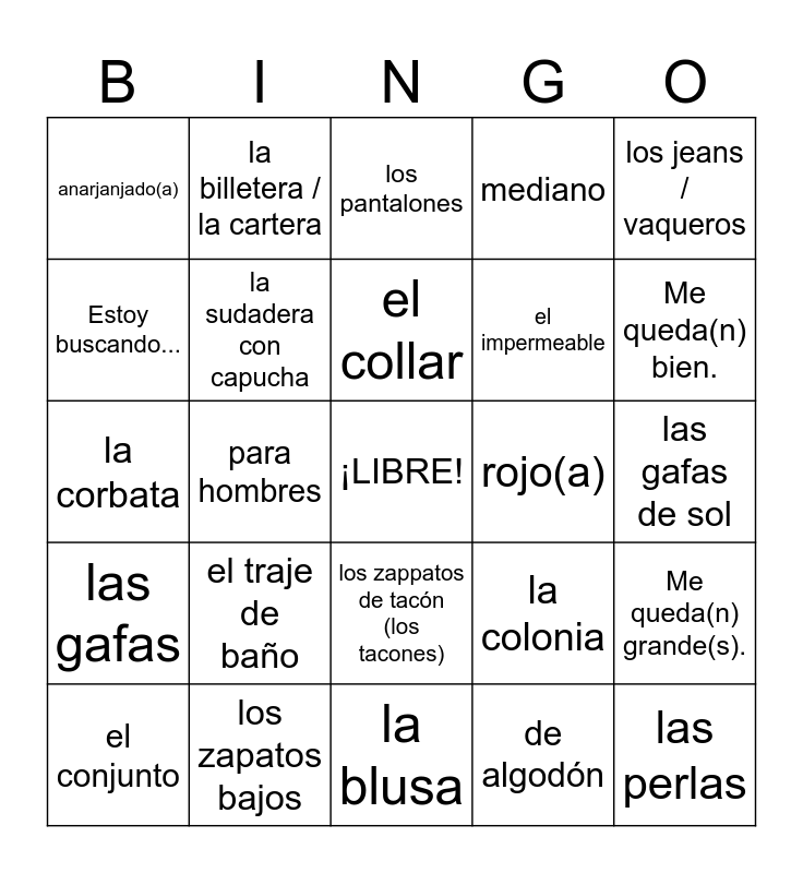 This bingo card has a free space and 94 words: la ropa, el abrigo, la blusa, las botas, los calcetines, la camisa, la camiseta, el conjunto, el chaleco, la chaqueta, la falda, la gorra / el gorro, los guantes, el impermeable, los leggings, los jeans / vaqueros, los pantalones, los pantalones cortos, los pijamas, la ropa interior, el sombrero, el suéter, las sandalias / las chanclas, el traje, el traje de baño, la sudadera con capucha, la sudadera, el uniforme, el vestido, las zapatos, los zapatos bajos, los zappatos de tacón (los tacones), el anillo, los aretes, la billetera / la cartera, la bolsa / el bolso, la bufanda, el cinturón, el collar, la colonia, la corbata, las gafas, las gafas de sol, las joyas, las perlas, el perfume, el paraguas, la pulsera, el recibo, el regalo, el reloj, de algodón, de seda, de lana, de oro, de plata, de bolitas, de rayas, sin mangas, para mujeres, para hombres, barato(a), caro(a), este / esta, estos / estas, ese / esa, esos / esas, ¿Cómo puedo ayudarte?, Estoy buscando..., ¿Cuánto cuesta(n)?, ¡Es una ganga!, ¿Qué talla?, llevar / usar, chico, mediano, grande, ¿Cómo te queda(n)?, Me queda(n) bien., Me queda(n) grande(s)., Me queda(n) pequeño/a(s)., ¿Cómo vas a pagar?, con crédito, en efectivo, rojo(a), anarjanjado(a), amarillo(a), verde, azul, morado(a), rosado(a), café / marrón, negro(a), blanco(a) and gris.
