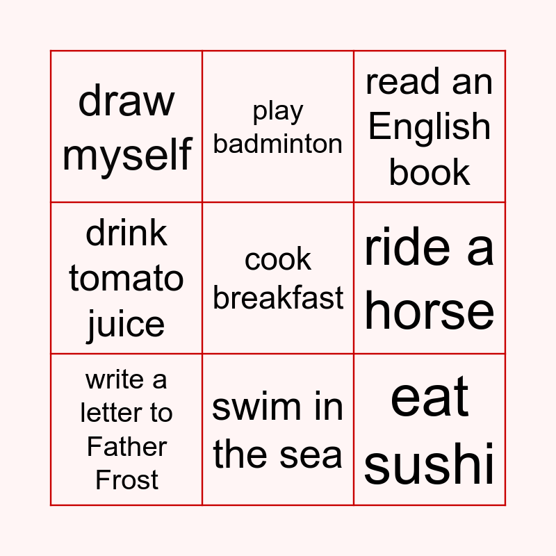This bingo card has a free space and 8 words: ride a horse, read an English book, play badminton, write a letter to Father Frost, draw myself, eat sushi, drink tomato juice and swim in the sea.