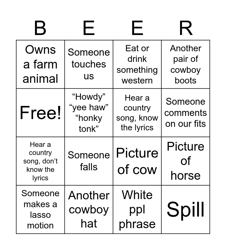 This bingo card has 16 words: Another cowboy hat, Picture of horse, Eat or drink something western, Owns a farm animal, Hear a country song, don’t know the lyrics, Someone touches us, Picture of cow, White ppl phrase, Free!, “Howdy” “yee haw” “honky tonk”, Someone makes a lasso motion, Another pair of cowboy boots, Someone falls, Someone comments on our fits, Hear a country song, know the lyrics and Spill.