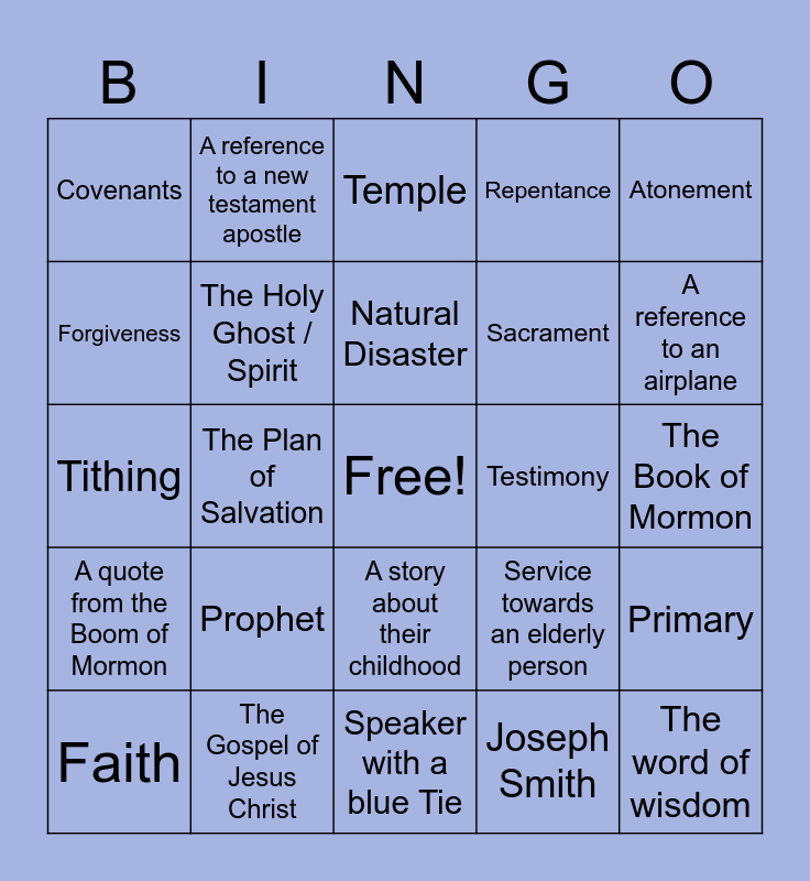 This bingo card has a free space and 29 words: Faith, Speaker recites a poem, The Plan of Salvation, Family History, Covenants, Temple, The Holy Ghost / Spirit, Prophet, Testimony, The Gospel of Jesus Christ, The Book of Mormon, The word of wisdom, Speaker with a blue Tie, Joseph Smith, A reference to an airplane, A prophet from the Old Testament, A story about their childhood, A quote from the Boom of Mormon, Atonement, Tithing, Service towards an elderly person, Baptism, Sacrament, Forgiveness, Repentance, A reference to a new testament apostle, Primary, Natural Disaster and Family History / genealogy.