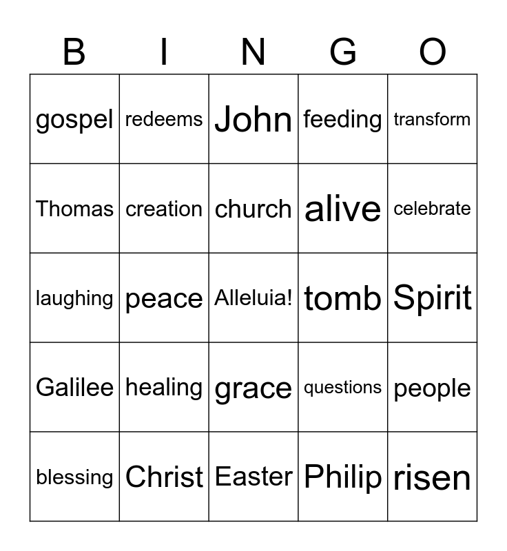 This bingo card has a free space and 27 words: questions, Mary, alive, Easter, Thomas, John, redeems, Galilee, tomb, people, laughing, feeding, blessing, Christ, celebrate, garden, creation, church, healing, gospel, Spirit, Philip, peace, risen, grace, transform and towel.