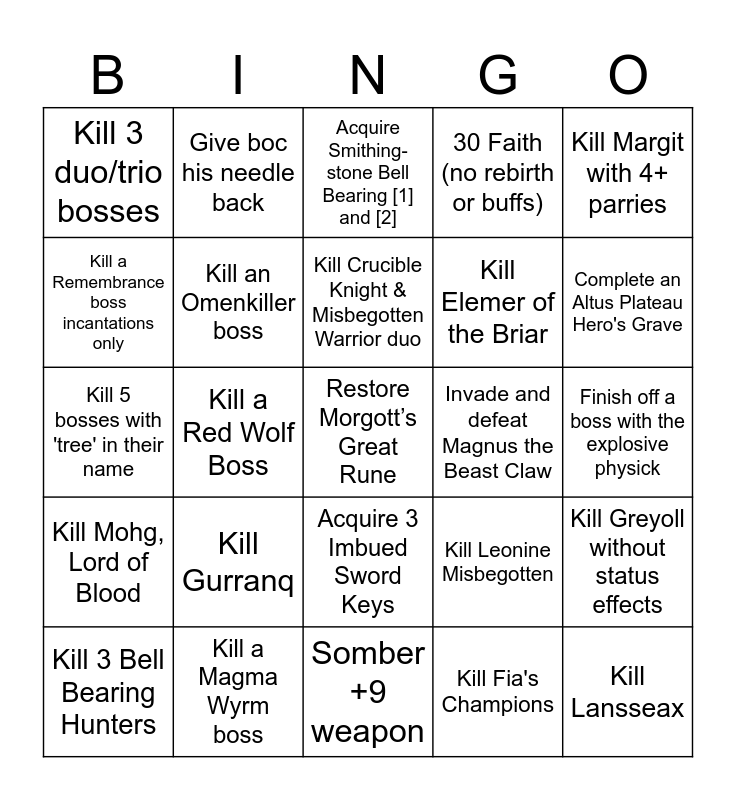 This bingo card has 25 words: Kill Mohg, Lord of Blood, Kill a Magma Wyrm boss, Restore Morgott’s Great Rune, Kill Fia's Champions, Kill Margit with 4+ parries, Kill 3 duo/trio bosses, Give boc his needle back, Acquire Smithing-stone Bell Bearing [1] and [2], Invade and defeat Magnus the Beast Claw, Kill Greyoll without status effects, Kill a Remembrance boss incantations only, Kill an Omenkiller boss, Somber +9 weapon, Kill Leonine Misbegotten, Complete an Altus Plateau Hero's Grave, Kill 3 Bell Bearing Hunters, Kill a Red Wolf Boss, Kill Crucible Knight & Misbegotten Warrior duo, Kill Elemer of the Briar, Finish off a boss with the explosive physick, Kill 5 bosses with 'tree' in their name, Kill Gurranq, Acquire 3 Imbued Sword Keys, 30 Faith (no rebirth or buffs) and Kill Lansseax.