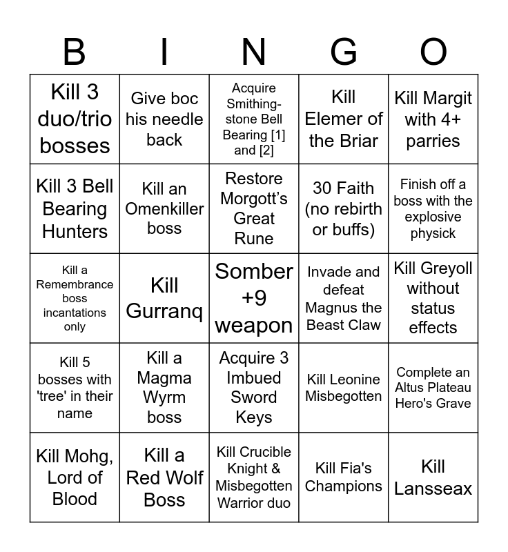 This bingo card has a free space and 24 words: Kill Mohg, Lord of Blood, Kill a Magma Wyrm boss, Restore Morgott’s Great Rune, Kill Fia's Champions, Kill Margit with 4+ parries, Kill 3 duo/trio bosses, Give boc his needle back, Acquire Smithing-stone Bell Bearing [1] and [2], Invade and defeat Magnus the Beast Claw, Kill Greyoll without status effects, Kill a Remembrance boss incantations only, Kill an Omenkiller boss, Kill Leonine Misbegotten, Complete an Altus Plateau Hero's Grave, Kill 3 Bell Bearing Hunters, Kill a Red Wolf Boss, Kill Crucible Knight & Misbegotten Warrior duo, Kill Elemer of the Briar, Finish off a boss with the explosive physick, Kill 5 bosses with 'tree' in their name, Kill Gurranq, Acquire 3 Imbued Sword Keys, 30 Faith (no rebirth or buffs) and Kill Lansseax.