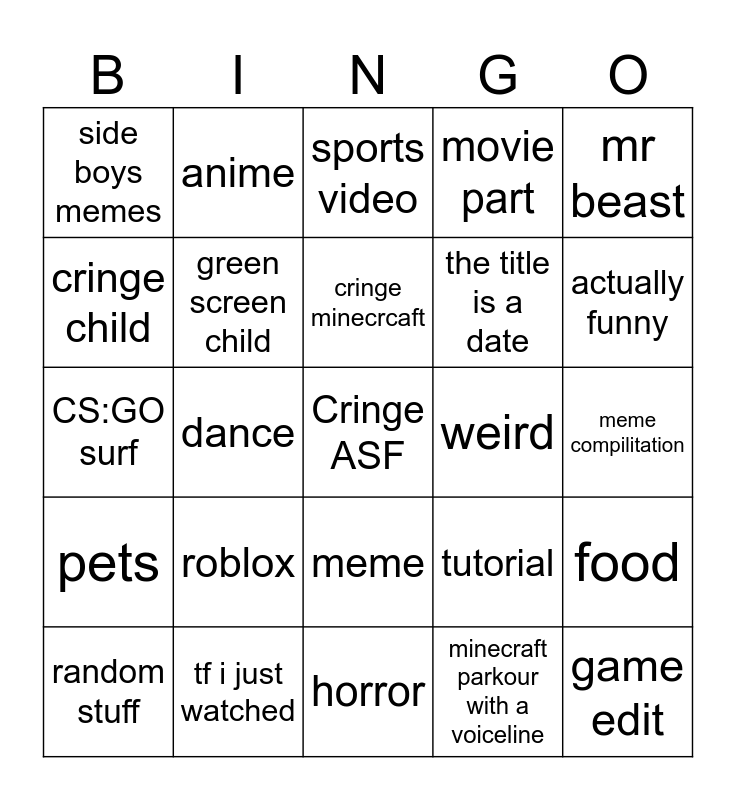 This bingo card has a free space and 24 words: roblox, tf i just watched, cringe minecrcaft, random stuff, mr beast, side boys memes, cringe child, anime, weird, meme, the title is a date, CS:GO surf, tutorial, food, green screen child, minecraft parkour with a voiceline, meme compilitation, sports video, actually funny, dance, game edit, pets, movie part and horror.