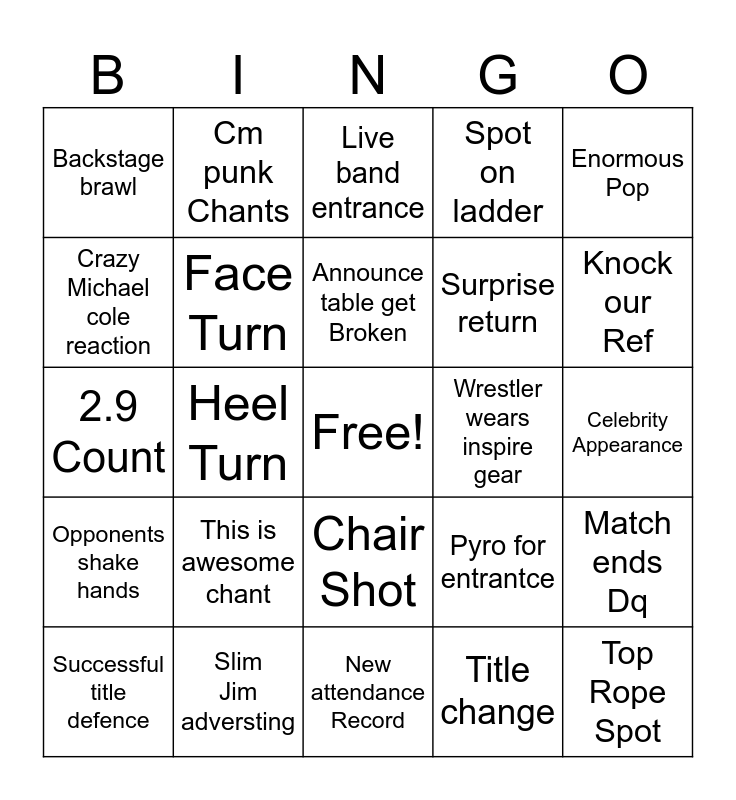 This bingo card has a free space and 24 words: This is awesome chant, Slim Jim adversting, Announce table get Broken, Successful title defence, Enormous Pop, Backstage brawl, Crazy Michael cole reaction, Cm punk Chants, Wrestler wears inspire gear, Chair Shot, Surprise return, 2.9 Count, Pyro for entrantce, Match ends Dq, Face Turn, Title change, Celebrity Appearance, Live band entrance, Knock our Ref, Heel Turn, Top Rope Spot, Opponents shake hands, Spot on ladder and New attendance Record.