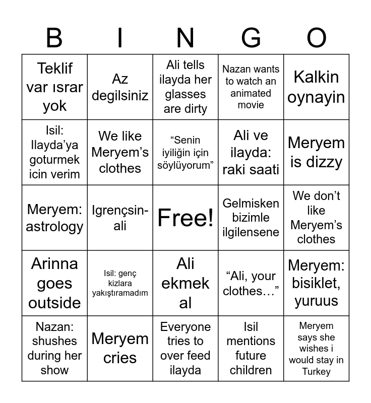 This bingo card has a free space and 24 words: Isil: genç kizlara yakıştıramadım, Meryem cries, “Senin iyiliğin için söylüyorum”, Nazan: shushes during her show, Kalkin oynayin, Teklif var ısrar yok, Isil: Ilayda’ya goturmek icin verim, Az degilsiniz, Gelmisken bizimle ilgilensene, Ali ekmek al, Ali ve ilayda: raki saati, Meryem: astrology, “Ali, your clothes…”, Meryem: bisiklet, yuruus, We like Meryem’s clothes, Isil mentions future children, We don’t like Meryem’s clothes, Ali tells ilayda her glasses are dirty, Meryem is dizzy, Igrençsin-ali, Meryem says she wishes i would stay in Turkey, Arinna goes outside, Nazan wants to watch an animated movie and Everyone tries to over feed ilayda.