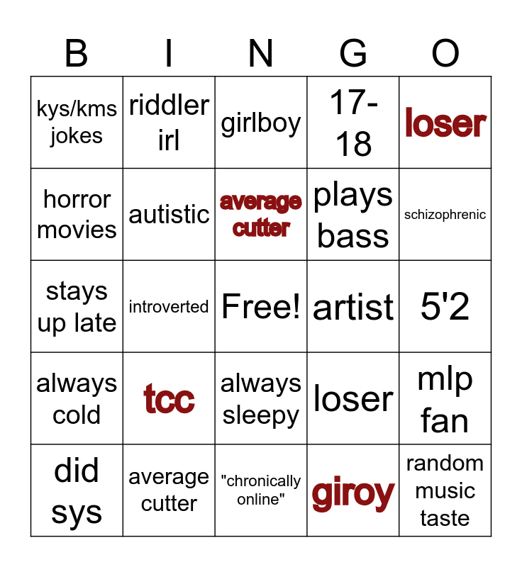 This bingo card has a free space and 24 words: did sys, tcc, average cutter, giroy, loser, kys/kms jokes, riddler irl, girlboy, artist, 5'2, stays up late, autistic, loser, mlp fan, horror movies, average cutter, "chronically online", 17-18, schizophrenic, always cold, introverted, always sleepy, plays bass and random music taste.