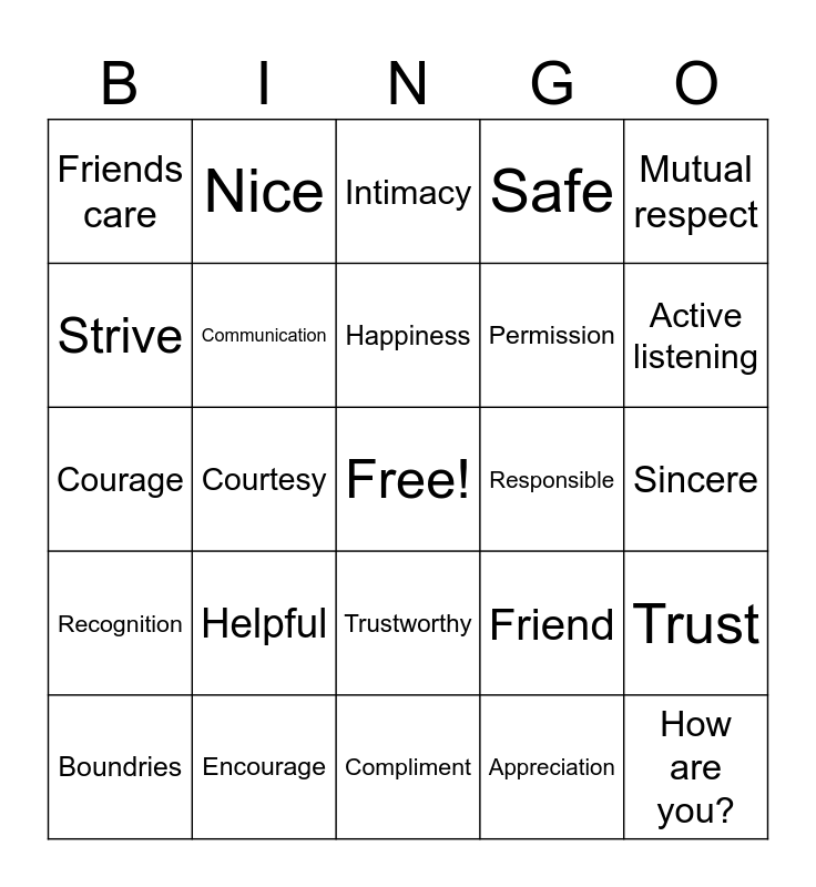This bingo card has a free space and 58 words: Support, Encourage, Respect, Recognition, Appreciation, Gratitude, Communication, Give & Take, Permission, Privacy, Safe, Equality, Companionship, Kindness, Accepting, Friends care, How are you?, Mutual respect, Wants / Needs, Happiness, Responsible, Intimacy, Boundries, Trust, Thoughtful, Sincere, Gives Compliments, Similar values, Active listening, Have fun together, Supports hobbies, Happy, Loved, Feel comfortable, Say nice things, Listen to other person, Share your thoughts, Courtesy, Courage, Manners, Helpful, Integrity, Friend, Willing, Apology, Optimism, Empathy, Trustworthy, Compliment, Please, Care, Thanks, Cooperation, Honesty, Nice, Listening, Strive and Trait.