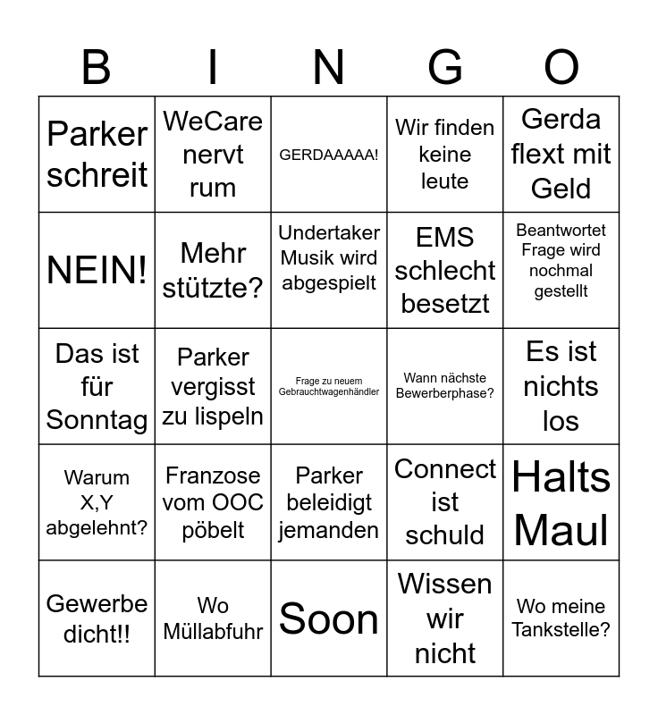 This bingo card has 25 words: Franzose vom OOC pöbelt, Soon, Undertaker Musik wird abgespielt, Gewerbe dicht!!, Gerda flext mit Geld, Parker schreit, NEIN!, WeCare nervt rum, Wann nächste Bewerberphase?, Parker beleidigt jemanden, EMS schlecht besetzt, Das ist für Sonntag, Connect ist schuld, Halts Maul, Mehr stützte?, Wo meine Tankstelle?, Es ist nichts los, GERDAAAAA!, Beantwortet Frage wird nochmal gestellt, Parker vergisst zu lispeln, Frage zu neuem Gebrauchtwagenhändler, Wo Müllabfuhr, Warum X,Y abgelehnt?, Wir finden keine leute and Wissen wir nicht.