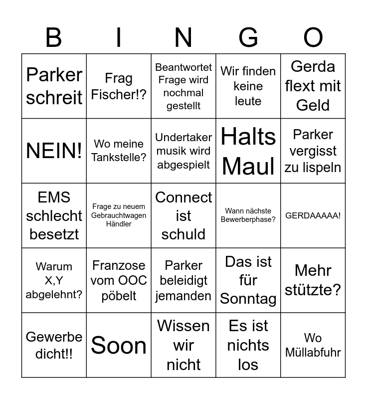 This bingo card has a free space and 24 words: Franzose vom OOC pöbelt, Soon, Undertaker musik wird abgespielt, Gewerbe dicht!!, Gerda flext mit Geld, Parker schreit, NEIN!, Frag Fischer!?, Wann nächste Bewerberphase?, Parker beleidigt jemanden, Halts Maul, EMS schlecht besetzt, Das ist für Sonntag, Mehr stützte?, Wo meine Tankstelle?, Es ist nichts los, GERDAAAAA!, Beantwortet Frage wird nochmal gestellt, Parker vergisst zu lispeln, Frage zu neuem Gebrauchtwagen Händler, Wo Müllabfuhr, Warum X,Y abgelehnt?, Wir finden keine leute and Wissen wir nicht.