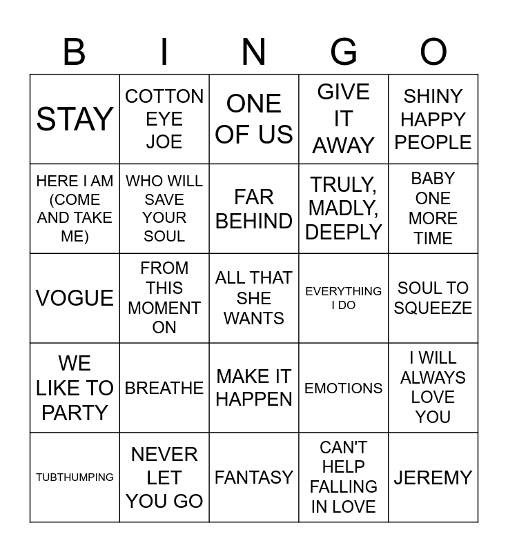 This bingo card has a free space and 34 words: TAKE A BOW, CAN'T HELP FALLING IN LOVE, LOVEFOOL, THE SIGN, WE LIKE TO PARTY, WHO WILL SAVE YOUR SOUL, SHINY HAPPY PEOPLE, TUBTHUMPING, COTTON EYE JOE, DAUGHTER, FAR BEHIND, ONE OF US, JUST A GIRL, IT'S YOUR LOVE, EVERYTHING I DO, BABY ONE MORE TIME, NEVER LET YOU GO, VOGUE, BREATHE, EMOTIONS, MAKE IT HAPPEN, ALWAYS BE MY BABY, STAY, SOUL TO SQUEEZE, FANTASY, JEREMY, GIVE IT AWAY, I WANT YOU, TRULY, MADLY, DEEPLY, HERE I AM (COME AND TAKE ME), FROZEN, FROM THIS MOMENT ON, I WILL ALWAYS LOVE YOU and HALLELUJAH.