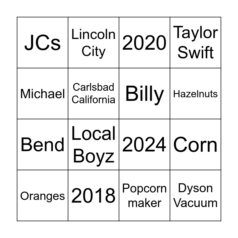 This bingo card has 22 words: 2018, Prison Mike, Lincoln City, Sig Ep, Carlsbad California, Billy, JCs, 2020, 2024, Dyson Vacuum, Bend, Taylor Swift, Boston, Baker Beach / San Francisco, Popcorn maker, Oregon State, Corn, Oranges, Local Boyz, Michael, Hazelnuts and Sweethearts.
