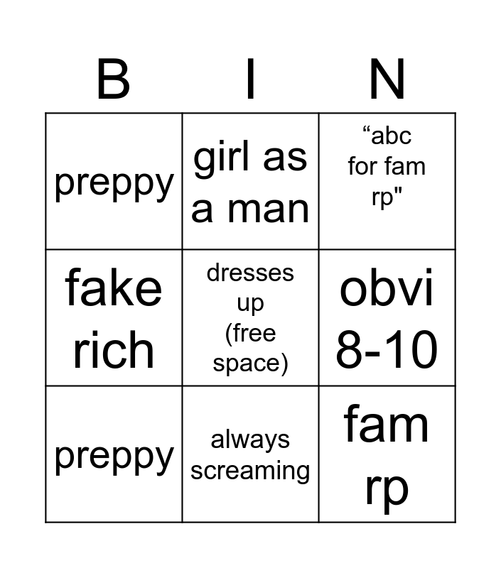 This bingo card has a free space and 20 words: *sleeps*, “....j@s0n🕷️🕸️🧟♀️”, “abc for fam rp", uses props, hs rp, fam rp, uses fastest car, preppy, avg robloxian, girl as a man, guy with the weird hair curl, troll/funny outfit, obvi 8-10, realistic face, preppy, qUrKiY, always screaming, fake rich, 2018 core and acts like theyre 17 but they actually 5.