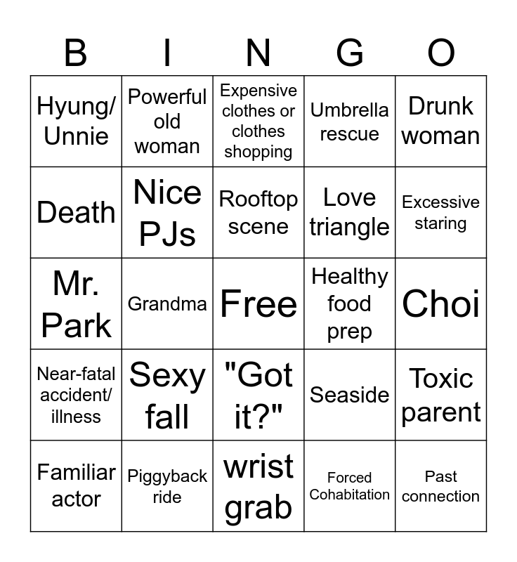 This bingo card has a free space and 24 words: Sexy fall, Piggyback ride, Rooftop scene, Familiar actor, Drunk woman, Hyung/ Unnie, Death, Powerful old woman, Healthy food prep, "Got it?", Love triangle, Mr. Park, Seaside, Toxic parent, Nice PJs, Forced Cohabitation, Choi, Expensive clothes or clothes shopping, Excessive staring, Grandma, Past connection, Near-fatal accident/ illness, Umbrella rescue and wrist grab.
