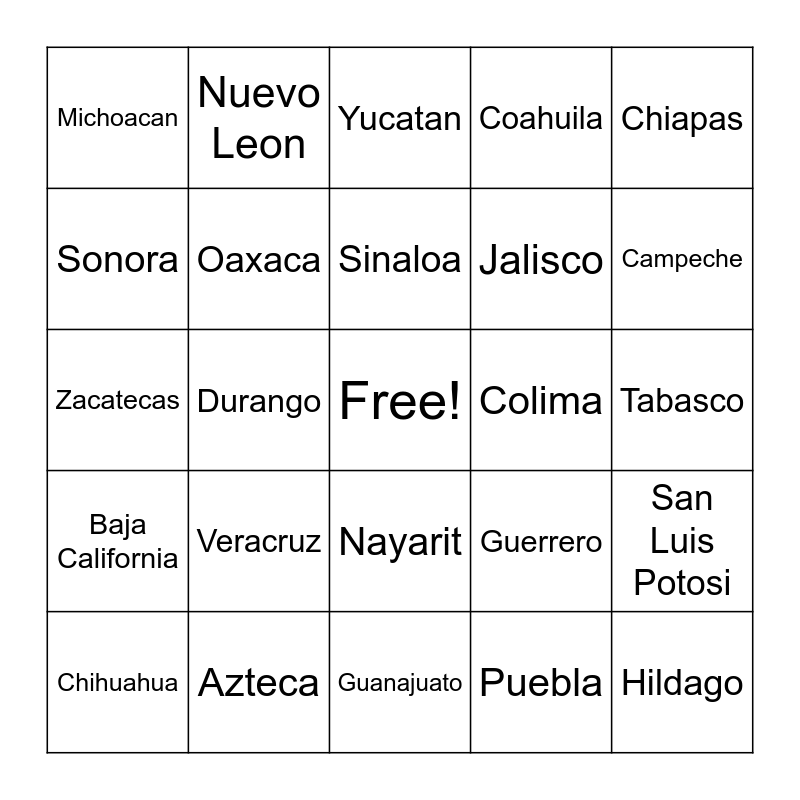 This bingo card has a free space and 24 words: Veracruz, Azteca, Sinaloa, Chihuahua, Chiapas, Michoacan, Sonora, Nuevo Leon, Colima, Nayarit, Jalisco, Zacatecas, Guerrero, San Luis Potosi, Oaxaca, Puebla, Tabasco, Yucatan, Campeche, Durango, Hildago, Baja California, Coahuila and Guanajuato.