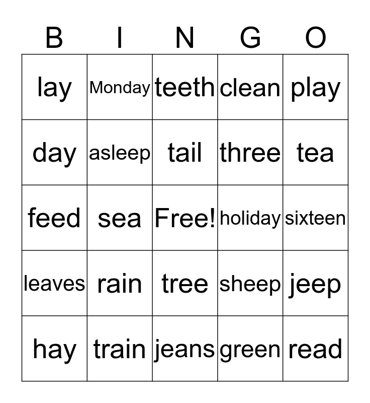 This bingo card has a free space and 24 words: rain, train, tail, hay, play, lay, day, Monday, holiday, tree, three, feed, sheep, jeep, asleep, green, sixteen, teeth, tea, sea, read, leaves, clean and jeans.