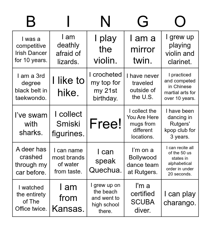 This bingo card has a free space and 24 words: I can name most brands of water from taste., I am from Kansas., I crocheted my top for my 21st birthday., I watched the entirety of The Office twice., I grew up playing violin and clarinet., I was a competitive Irish Dancer for 10 years., I am a 3rd degree black belt in taekwondo., I am deathly afraid of lizards., I collect the You Are Here mugs from different locations., I can speak Quechua., I have never traveled outside of the U.S., I’ve swam with sharks., I’m on a Bollywood dance team at Rutgers., I can recite all of the 50 us states in alphabetical order in under 20 seconds., I like to hike., I'm a certified SCUBA diver., I have been dancing in Rutgers' kpop club for 3 years., I play the violin., I practiced and competed in Chinese martial arts for over 10 years., I collect Smiski figurines., I can play charango., A deer has crashed through my car before., I am a mirror twin. and I grew up on the beach and went to high school there..