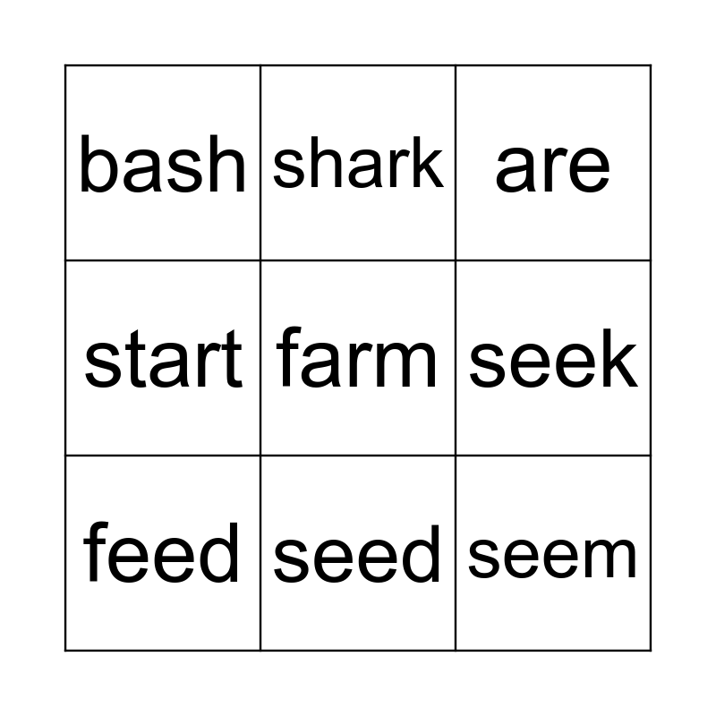 This bingo card has 45 words: Free!, car, cart, card, dart, barn, are, arm, farm, part, start, bar, bark, park, dark, spark, shed, fish, cash, ship, shark, dish, gosh, bash, dash, mash, rash, crash, shop, shot, sharp, finish, bee, feet, sleep, jeep, sheep, beep, see, seed, seek, seem, fee, feed and keep.