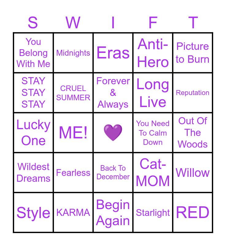 This bingo card has a free space and 44 words: Enchanted, RED, Sparks Fly, Style, Our Song, Starlight, Eras, Everything Has Changed, Picture to Burn, KARMA, Anti-Hero, You Need To Calm Down, Back To December, Fearless, It’s My B-Tay!!, Begin Again, The Story Of Us, Lucky One, Gold Rush, Reputation, Midnights, Lavender Haze, Shake It Off!, You Belong With Me, Teardrops On My Guitar, Out Of The Woods, 1989, Folklore, Cat-MOM, Wildest Dreams, Fifteen, Willow, Paper Rings, Bad Blood, ME!, Blank Space, Lover, Speak Now, Forever & Always, STAY STAY STAY, Long Live, Look What You Made Me Do, CRUEL SUMMER and 22.