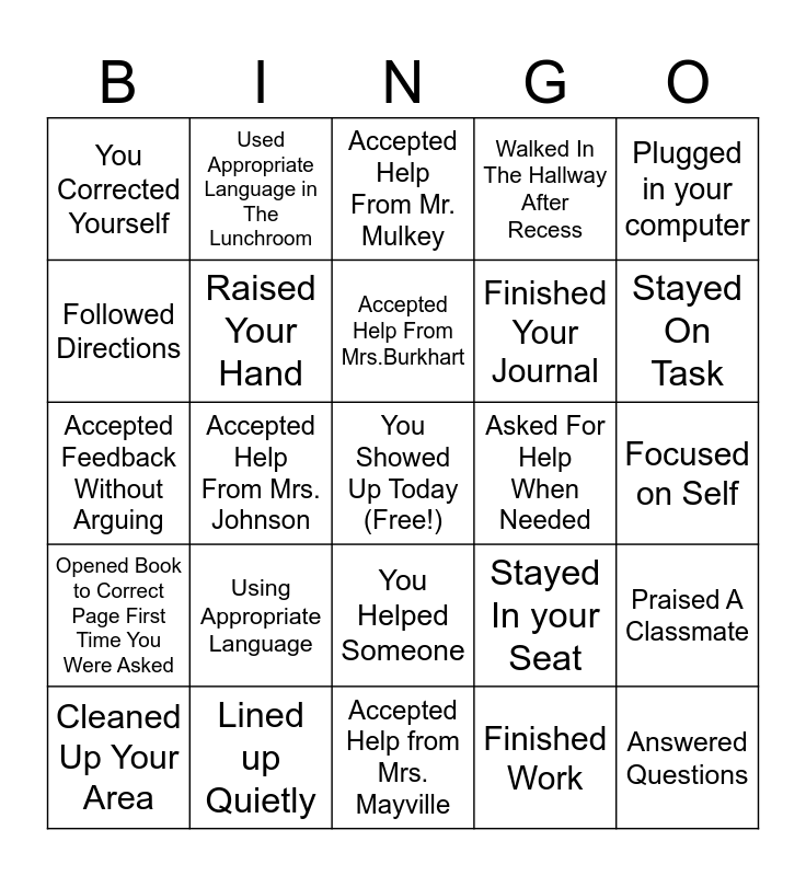 This bingo card has a free space and 24 words: Using Appropriate Language, Lined up Quietly, Accepted Help From Mrs.Burkhart, Cleaned Up Your Area, Plugged in your computer, You Corrected Yourself, Followed Directions, Used Appropriate Language in The Lunchroom, Asked For Help When Needed, You Helped Someone, Finished Your Journal, Accepted Feedback Without Arguing, Stayed In your Seat, Praised A Classmate, Raised Your Hand, Finished Work, Focused on Self, Accepted Help From Mr. Mulkey, Stayed On Task, Accepted Help From Mrs. Johnson, Answered Questions, Opened Book to Correct Page First Time You Were Asked, Walked In The Hallway After Recess and Accepted Help from Mrs. Mayville.