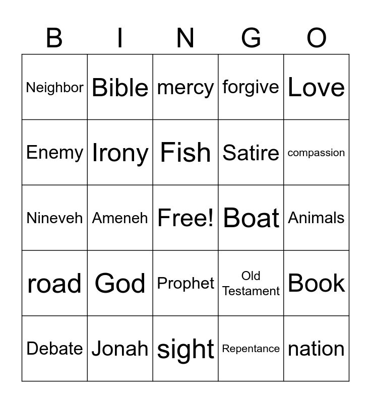 This bingo card has a free space and 24 words: God, Jonah, Fish, Debate, Love, Neighbor, Enemy, Bible, Boat, Prophet, Satire, Nineveh, Old Testament, Book, Irony, Repentance, Animals, mercy, compassion, Ameneh, nation, road, forgive and sight.