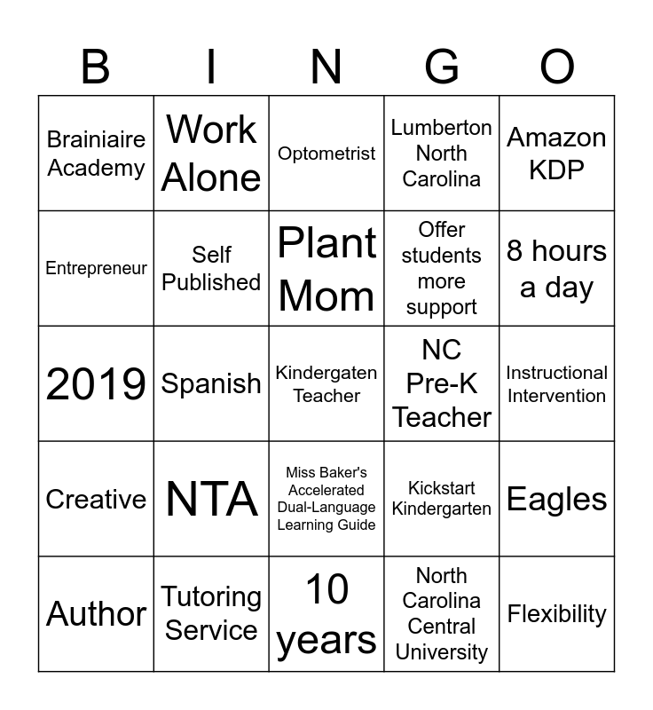This bingo card has 35 words: English Spanish, Tutoring Services, Voyage Raleigh, Self Published, Miss Baker's Accelerated Dual-Language Learning Guide, Lumberton North Carolina, Entrepreneur, Purple, Plant Mom, Brick's Book of What Ifs, 2019, Amazon KDP, Free!, Canvas Rebel, Brainiaire Academy, NC Pre-K Teacher, North Carolina Central University, Spanish, Creative, Kindergaten Teacher, Kickstart Kindergarten, Author, Eagles, Tutoring Service, Optometrist, 8 hours a day, Flexibility, My own boss, Offer students more support, Instructional Intervention, Instructional Enrichment, 10 years, NTA, Work Alone and Travel.