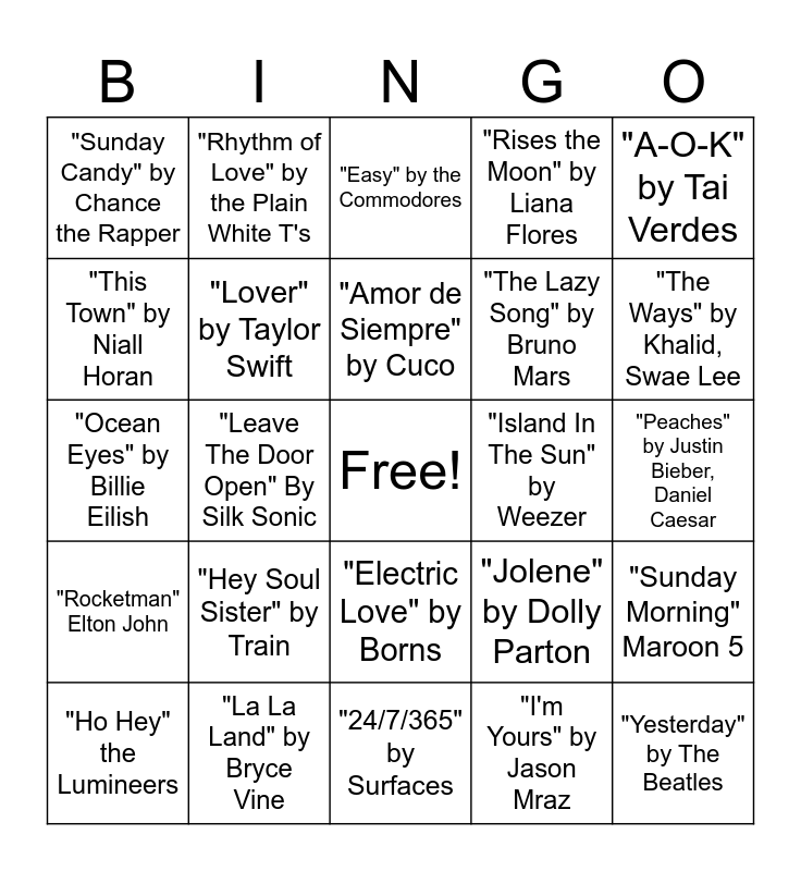This bingo card has a free space and 28 words: "Sunday Morning" Maroon 5, "LOVE.FEAT. ZACARI." Kendrick Lamar, Zacari, "The Lazy Song" by Bruno Mars, "I'm Yours" by Jason Mraz, "This Town" by Niall Horan, "Easy" by the Commodores, "Rhythm of Love" by the Plain White T's, "Rocketman" Elton John, "Island In The Sun" by Weezer, "Ho Hey" the Lumineers, "Ocean Eyes" by Billie Eilish, "Rises the Moon" by Liana Flores, "La La Land" by Bryce Vine, "24/7/365" by Surfaces, "The Ways" by Khalid, Swae Lee, "Slow Dancing in the Dark" by Joji, "Hey Soul Sister" by Train, "Lover" by Taylor Swift, "Amor de Siempre" by Cuco, "Electric Love" by Borns, "Sunday Candy" by Chance the Rapper, "Waves" by Mr. Probz, Robin Schultz, "Yesterday" by The Beatles, "Leave The Door Open" By Silk Sonic, "Peaches" by Justin Bieber, Daniel Caesar, "Jolene" by Dolly Parton, "A-O-K" by Tai Verdes and "Everybody Wants to Rule The World" by Tear For Fears.