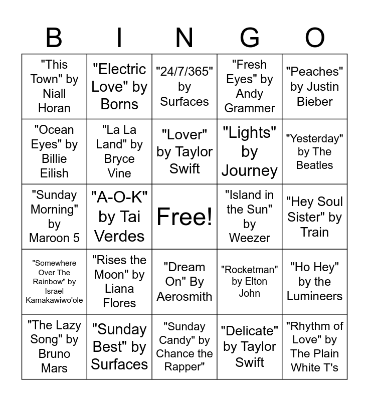 This bingo card has a free space and 25 words: "Rises the Moon" by Liana Flores, "Sunday Candy" by Chance the Rapper", "Lover" by Taylor Swift, "The Lazy Song" by Bruno Mars, "Peaches" by Justin Bieber, "This Town" by Niall Horan, "Ocean Eyes" by Billie Eilish, "Electric Love" by Borns, "Island in the Sun" by Weezer, "Dream On" By Aerosmith, "Lights" by Journey, "Sunday Morning" by Maroon 5, "Rocketman" by Elton John, "Ho Hey" by the Lumineers, "La La Land" by Bryce Vine, "Jolene" by Dolly Parton, "Hey Soul Sister" by Train, "24/7/365" by Surfaces, "Yesterday" by The Beatles, "A-O-K" by Tai Verdes, "Rhythm of Love" by The Plain White T's, "Sunday Best" by Surfaces, "Somewhere Over The Rainbow" by Israel Kamakawiwo'ole, "Fresh Eyes" by Andy Grammer and "Delicate" by Taylor Swift.